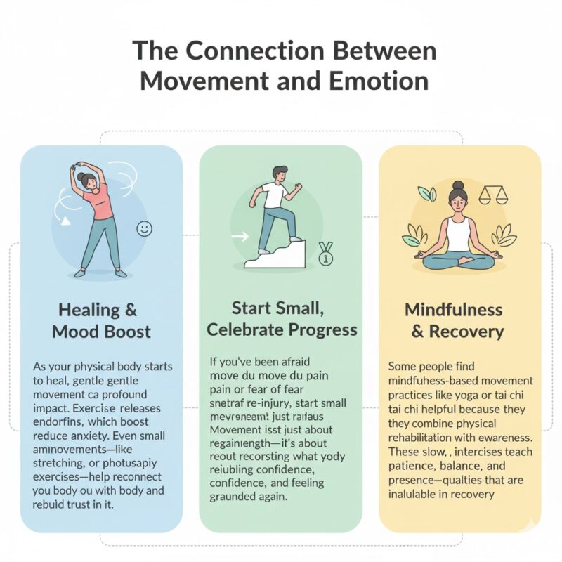 As your physical body starts to heal, gentle movement can have a profound emotional impact. Exercise releases endorphins, which boost mood and reduce anxiety. Even small movements—like stretching, walking, or physiotherapy exercises—help reconnect you with your body and rebuild trust in it.